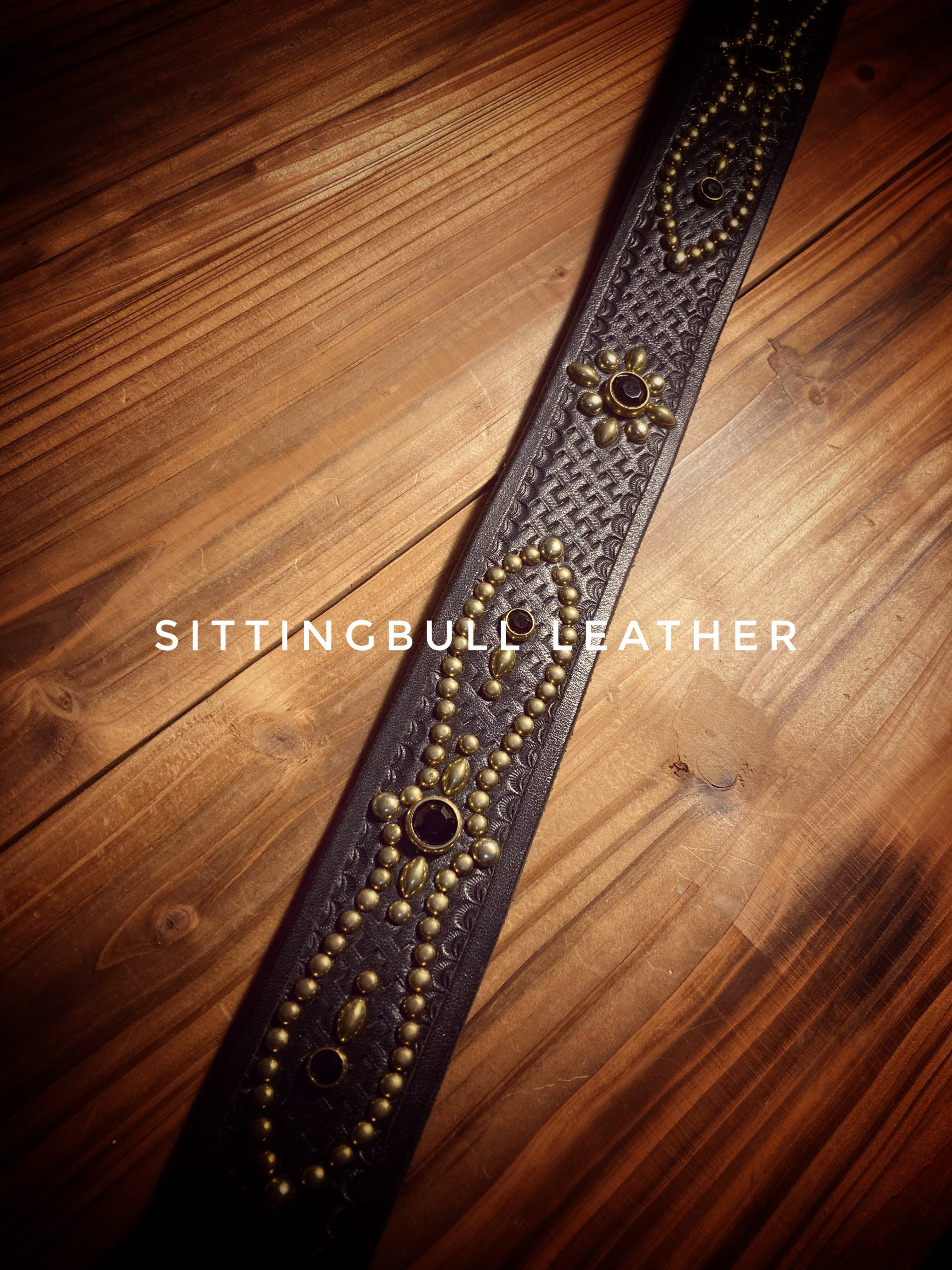 スタッズベルトは高品質な3.8mm厚の本皮革を使用し、バスケット柄のカービングを施したヴィンテージ風デザインに仕上げました。